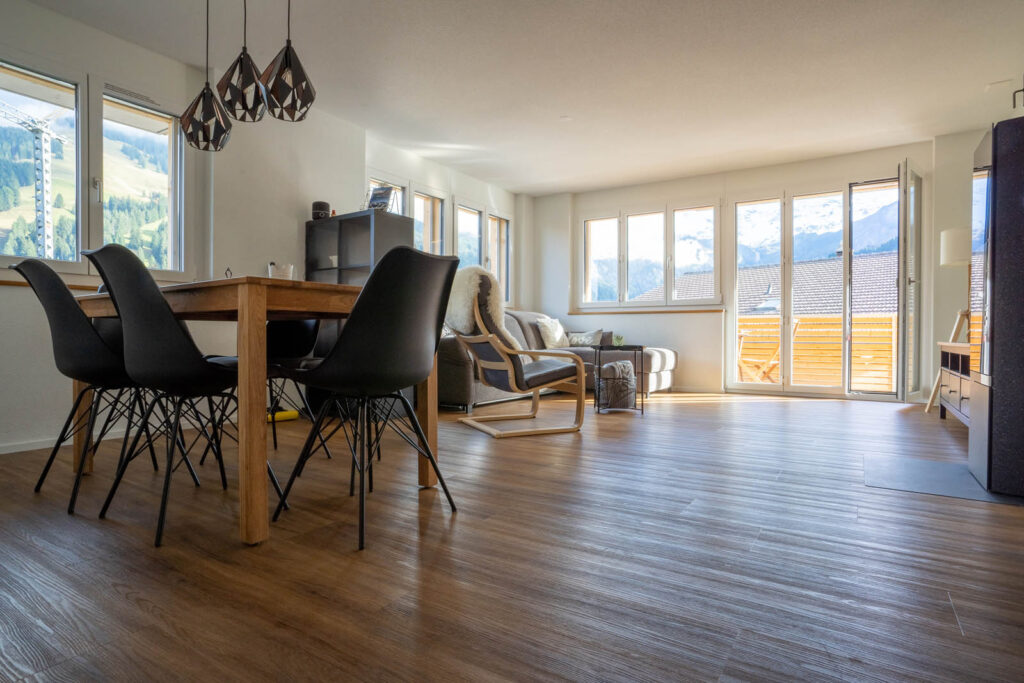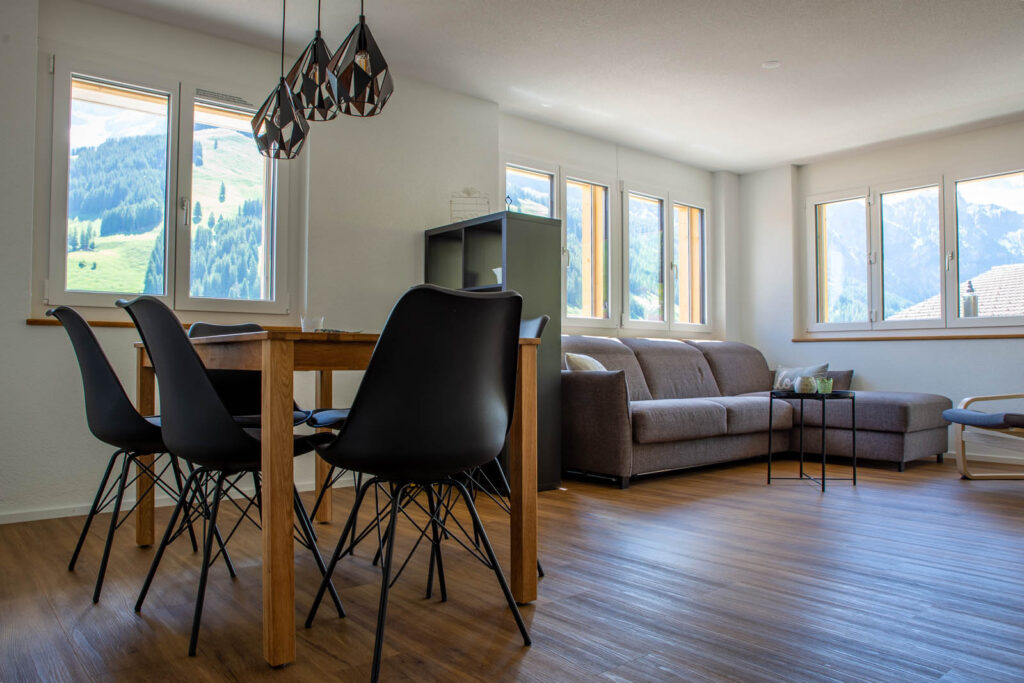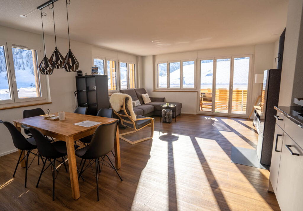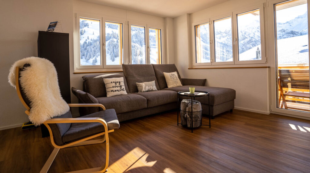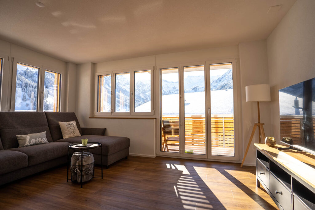 Von der Wohnung oder der grosszügigen Terasse aus geniesst Du die prächtige Aussicht auf das majestätische Bergpanorama. Nach dem Ausflug entspannst du dich abends gemütlich auf dem Sofa oder in der Badewanne mit einem Getränk deiner Wahl.