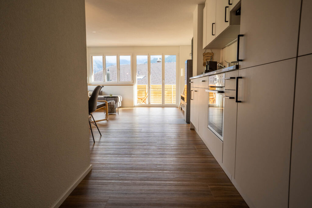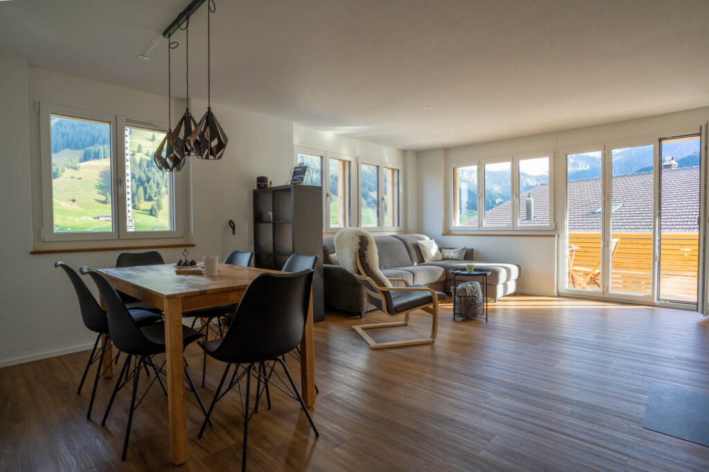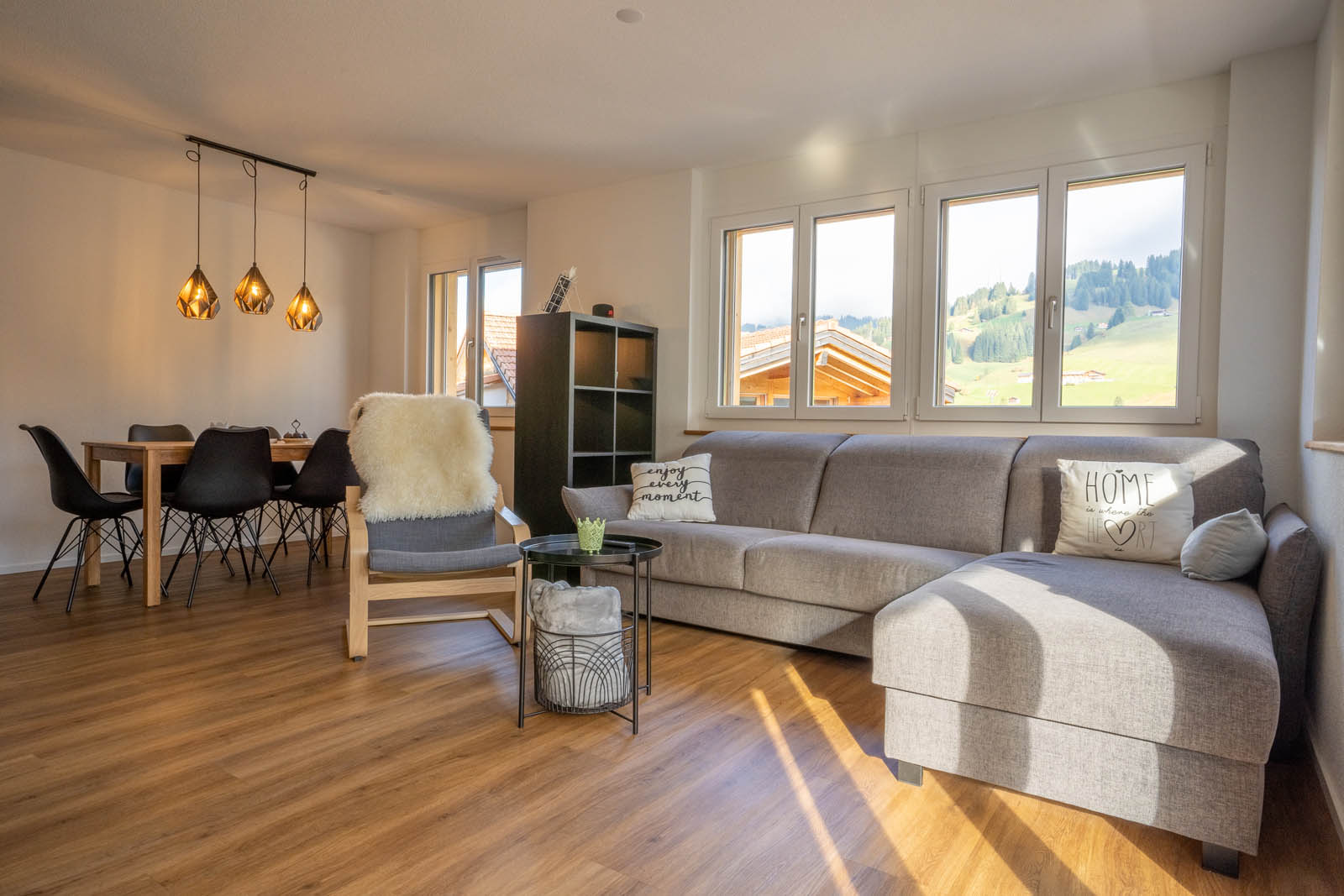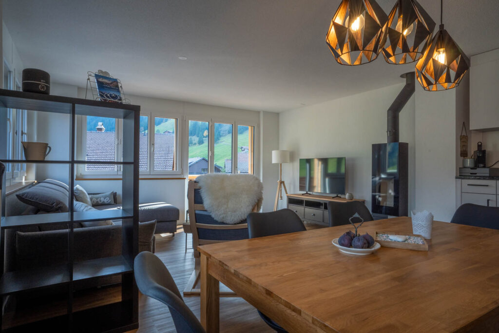 Von der Wohnung oder der grosszügigen Terasse aus geniesst Du die prächtige Aussicht auf das majestätische Bergpanorama. Nach dem Ausflug entspannst du dich abends gemütlich auf dem Sofa oder in der Badewanne mit einem Getränk deiner Wahl.